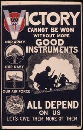 Keywords: Victory cannot be won without more good instruments. Our army, our navy, our air force all depend on us. Let's give... - NARA - 535172.tif Scope and content General notes 535172 Local identifier 179-WP-1322 Office for Emergency Management War Production Board 01/1942 - 11/03/1945 Still Picture Records Section Special Media Archives Services Division NWCS-S National Archives at College Park 8601 Adelphi Road College Park MD 20740-6001 other date circa 1942 1943 Record group Record Group 179 Records of the War Production Board 1918 - 1947 Record group ARC 508 War Production Board compiled 1942 - 1943 Series ARC 533858 File unit File unit ARC Variant control numbers NAIL Control Number NWDNS-179-WP-1322 yes Other versions <gallery> File Victory_cannot_be_won_without_more_good_instruments _Our_army _our_navy _our_air_force_all_depend_on_us _Let's_give _-_NARA_-_535172 tif tif File Victory_cannot_be_won_without_more_good_instruments _Our_army _our_navy _our_air_force_all_depend_on_us _Let's_give _-_NARA_-_535172 jpg jpg </gallery> NARA-cooperation PD-USGov World War II posters from the United States NARA TIF images with categorized JPGs |