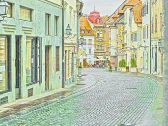 Keywords: VidGajsek - WAY US838.jpg en wet Upper Square traditional old catholic district of Ljubljana City Capital of Slovenia in Europe own Vid Gajšek 2012 Eleassar <sup> t/p </sup> 10 11 7 December 2012 UTC Upper Square Ljubljana Sett-paved streets in Ljubljana |