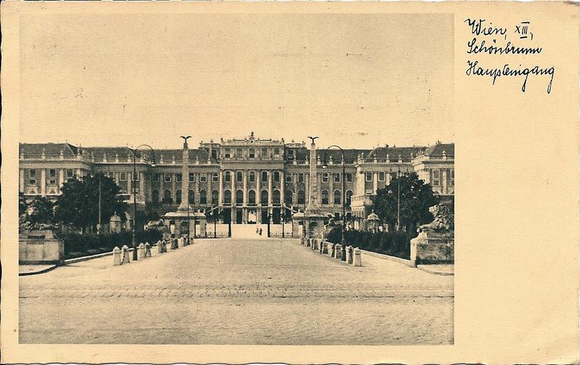 Keywords: Vienne Schönbrunn 1936.jpg fr Entrée principale du château de Schönbrunn à Vienne Autriche Carte postale Auteur anonyme - éditeur B K W II before 1936 date d'envoi postal de la carte PD-old Palace of Schönbrunn 1936 in Vienna