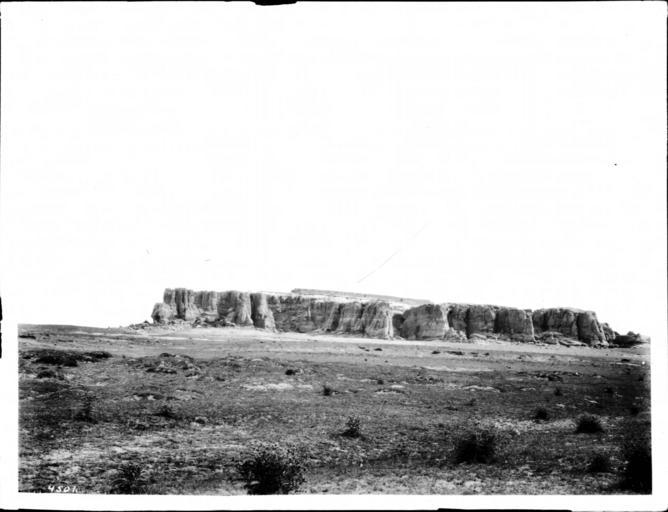 Photograph of a view of the Acoma Pueblo from Mesa Encantada, ca.1900. The Acoma Pueblo can be seen in the distance rising above the surrounding barren landscape. A few shrubs and scrub grass grow in the foreground.; "Acoma is situated about eighteen miles in a southeasterly direction from McCarthy Station on the Atlantic and Pacific Railway, midway between Albuquerque and Fort Wingate. Its people, like those of Moqui and Zuni, have retained to a great extent their ancient customs. The walls of light-tinted sandstone, "nearly everywhere vertical or overhanging" of the bluff or "penol" on which the town stands rise from two hundred and fifty to three hundred feet above the plain. Against their bases the sand has blown in great drifts, extending far up into the recesses and fissures of the cliffs. Until within recent years, as in the days of its discovery by Alvarado, only one path gave access to the top. It is a toilsome and dangerous route, winding along the edge of frightful chasms, leading up through fissures, and passing over crags. In places steps have been hewn, and up the face of the naked rock holes have been cut to give a foothold to climbers, and the constant use of these holes by the Indians through centuries has worn them to the exact shape of the toe of a moccasin. Up this steep path an Acoma Indian with a live sheep on his shoulders will run rapidly without helping his ascent in any way by the use of his hands." -- Clarence Pullen.; "The Acomas use this foot-path yet, but they have in recent years made on the opposite side a horse trail, very steep and difficult, which winds up over immense sand drifts and steep rocky ledges to the top of the rock. Up this bridle-path animals that are accustomed to mountain climbing can go in single file. The surface of the top of the mesa, comprising about ten acres, is naturally a rough naked space destitute of vegetation. The town is constructed after the usual style of the pueblos of New Mexico, and consists of from sixty to seventy houses two or three stories high, built of adobe or of rubble-stone, rising terrace-shaped, with flat roofs. There are no windows in the first story, or doors, except in the roof, which is reached by means of ladders. Within the houses are several estufas, or apartments used as council-chambers and for the secret practice of the Acomas' ancient religious rites, including the maintenance of the sacred fire in honor of their ancient gods. The two has about eight hundred inhabitants, and is divided by three parallel streets." -- Clarence Pullen.