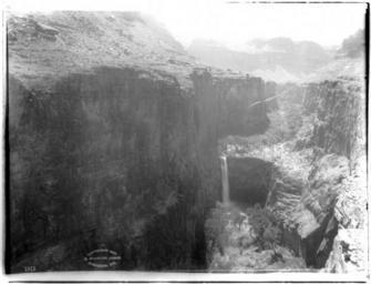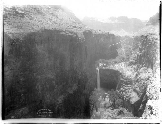 Keywords: View from above towards Mooney Falls in Havasu Canyon, Grand Canyon, ca.1899 (CHS-3823).jpg en <br> View from above towards Mooney Falls in Havasu Canyon Grand Canyon ca 1899 Photograph of the view from above towards Mooney Falls in Havasu Canyon Grand Canyon ca 1899 The falls spills out in a narrow ribbon flowing towards the river visible through vegetation on the canyon floor far below Nearly vertical rocky walls hem the falls in The canyon rim is visible in the distant background Call number CHS-3823 Photographer James George Wharton Filename CHS-3823 Coverage date circa 1899 Part of collection California Historical Society Collection 1860-1960 Format glass plate negatives Type images Part of subcollection Title Insurance and Trust and C C Pierce Photography Collection 1860-1960 Repository name USC Libraries Special Collections Accession number 3823 Archival file chs_Volume95/CHS-3823 tiff Repository address Doheny Memorial Library Los Angeles CA 90089-0189 Geographic subject country USA Format aacr2 1 photograph photoprint b w ; 20 x 25 cm ; 1 photograph glass photonegative b w ; 17 x 22 cm Rights Digitally reproduced by the USC Digital Library; From the California Historical Society Collection at the University of Southern California Subject adlf canyons Repository email specol usc edu Contributing entity California Historical Society Date created circa 1899 Publisher of the digital version University of Southern California Libraries Format aat photographs Geographic subject state Arizona Legacy record ID chs-m16400 Access conditions Send requests to address or e-mail given Phone 213 821-2366; fax 213 740-2343 Geographic subject canyons Havasu Canyon; canyons Grand Canyon Subject lcsh Parks; Canyons; Waterfalls Subject Parks -- Grand Canyon -- Mooney Falls circa 1899 date created James George Wharton http //digitallibrary usc edu/cdm/ref/collection/p15799coll65/id/16339 PD-old-70-1923 Images from USC Digital Library uploaded by Fæ California Historical Society Collection 1860-1960 Glass plate negatives Photographs by George Wharton James |