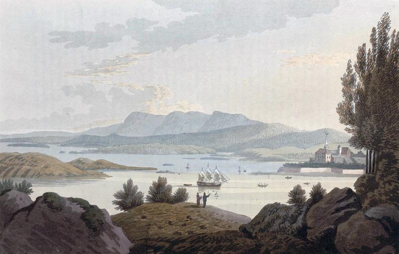 | Keywords: View from Egeberg (JW Edy plate 54).jpg Artwork Creator John William Edy Egeberg No LIV VIEW FROM EGEBERG This view was taken on the declivity of the farthest point of Egeberg where its sides descend precipitously into the Fiord nearly opposite the castle To form a faint idea of the expanse of the country and the waters about Christiania it is necessary to place this and the following view No 55 together which comprehend the whole scene as beheld from this spot presenting the appearance of an extensive and beautiful lake It was deemed expedient to divide it on two plates calculated to match exactly in order to shew the parts on a larger scale and at the same time adhere to the rule originally adopted of having no folding plates in this work On a line from the castle to the left are two of the Crown islands; they are covered with short burnt grass which gives them a brown aspect and are inhabited by two or three fishermen with their families On the long island or isthmus a little above them are the summer residences of the governor of Christiania and the commandant of the Akershus Fortress castle of Aggerhus A few other islands are seen in succession down the Fiord The ship seen under sail indicates by its position the deep channel leading into the port which lies between the garrison and Egeberg ; the water seen over its masts extending from the main land to the point of the governor's island is shallow and used by boats only The great points of attraction in this view are the three mountains of similar form seen in the distance terminating abruptly with precipices near the high road leading from Christiania to Drammen Dram and Kongsberg Konsberg which after coasting the shore leads up the side and over the top of one of them All ships passing to or from Christiania are most advantageously seen from the foreground of the picture In the woods of this mountain Egeberg the cadets from the military school exercise themselves in manæuvring and shooting with the rifle-gun One of their excursions took place when I was occupied with this view Having descried me half-a-dozen of them silently approached within gun shot and lay in ambush on their stomachs and backs concealed by the bushes and trees attentively observing my motions; a rustling among the leaves drew my attention and I saw the muzzles of their guns levelled at me which caused some merriment and afforded me an opportunity of seeing many of their extraordinary feats in military tactics and of their skill with the rifle-gun in bush-fighting The Norwegians certainly excel all others in the use of this little piece ; even a peasants boy will hit a bird flying in the eye or head with a ball from a gun of the rudest materials a vile barrel a Dutch lock set in a deal stock fashioned with his knife and charged moreover with bad powder If be by chance miss his aim he is rebuked severely and repeatedly for wasting the powder and shot until he is master of some secret unerring principles known only to the adepts themselves Collapse bottom http //urn nb no/URN NBN no-nb_digibok_2011072910001 Boydell's picturesque scenery of Norway London 1820 Plate no 54 p 289 in scanned copy no-nb_digibok_2011072910001 PD-Art-100 John William Edy Boydell's picturesque scenery of Norway Oslo in art Oslofjorden in art Ekeberg Views of Oslo from Ekeberg Historical images of Oslofjorden |