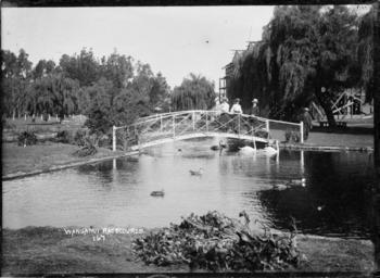 MAKE A MEME View Large Image View of three people on an arched footbridge, with swans and ducks on a small lake at the Wanganui Racecourse. Photograph taken by William Archer Price. Inscriptions: Inscribed - Photographer's title on negative -bottom left: Wanganui ...