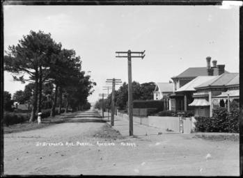 Keywords: blackandwhite monochrome outdoor photo border building architecture black and white View looking down St Stephens Ave from the intersection with Hobson Bay Road. The harbour can be seen in the far distance. A woman with a parasol is walking along a rough path on the lefthandside of St Stephens Ave in the shade of tall trees. Power poles line the righthand side of the street. Taken by William Archer Price in early 1900s. Inscriptions: Inscribed - Photographer's title on negative -bottom left: St Stephen's Ave. Parnell. Auckland. No 3097. William Archer Price lived and practised in Queen Street, Northcote, 1909-1910. Source: New Zealand Post Office directories Quantity: 1 b&w original negative(s). Physical Description: Dry plate glass negative 4.5 x 6.5 inches View looking down St Stephen's Avenue, Auckland. Price, William Archer, 1866-1948 :Collection of post card negatives. Ref: 1/2-000188-G. Alexander Turnbull Library, Wellington, New Zealand. natlib.govt.nz/records/22316596 View looking down St Stephens Ave from the intersection with Hobson Bay Road. The harbour can be seen in the far distance. A woman with a parasol is walking along a rough path on the lefthandside of St Stephens Ave in the shade of tall trees. Power poles line the righthand side of the street. Taken by William Archer Price in early 1900s. Inscriptions: Inscribed - Photographer's title on negative -bottom left: St Stephen's Ave. Parnell. Auckland. No 3097. William Archer Price lived and practised in Queen Street, Northcote, 1909-1910. Source: New Zealand Post Office directories Quantity: 1 b&w original negative(s). Physical Description: Dry plate glass negative 4.5 x 6.5 inches View looking down St Stephen's Avenue, Auckland. Price, William Archer, 1866-1948 :Collection of post card negatives. Ref: 1/2-000188-G. Alexander Turnbull Library, Wellington, New Zealand. natlib.govt.nz/records/22316596 |