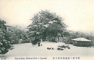Keywords: View of Snow, Michinoo Park at Nagasaki ca 1900.jpg en Historical postcard of Japan Historical postcard author ca 1900 PD-old Historical postcards of Japan