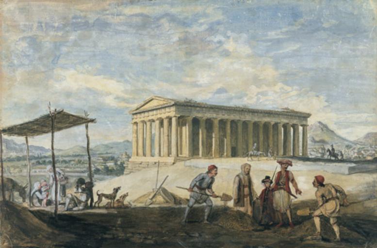 | Keywords: View of the Temple of Theseus by James Athenian Stuart.jpg  en Temple of Theseus in Athens James Athenian Stuart uk Х ам Гефеста в Афінах Джеймс «Афінянин» Стюа т Ο  ίνακας α εικόνιζει τον ναό του Θησείου Βλέ ουμε Αλβανούς χωρικούς να λιχνίζουν σιτηρά στο χώρο μ ροστά στον ναό ρίχνοντας τον καρ ό ψηλά ενώ φυσάει το μεσογειακό αεράκι Ένας Τούρκος υ ηρέτης μαζί με τον υιό του αφεντικού του του δίνουν εντολές τι να κάνει Ένας άλλος Αλβανός μαζί με την γυναίκα του και το  αιδί του κάθονται κάτω α ό τον ίσκιο ενός λυόμενου υ όστεγου  ου το ονομάζουν «καλύβι» Οι Αλβανοί είναι χριστιανικός ορθόδοξος  ληθυσμός  ου ασχολείται με την γεωργία και ομιλούν την δική τους γλώσσα Το υ έδαφος μ ροστά στο ναό έχει διαβρωθεί α ό τις βροχές και φαίνονται ο στερεοβάτης Στο βάθος διακρίνουμε τον Υμηττός και τα Τουρκοβούνια Α ό την άλλη μεριά ο Κηφισός  οταμός ρέει στην κοιλάδα των Πατησίων http //www vam ac uk/images/image/50996-popup html Creator James Stuart 1750-60 Historical images of Temple of Hephaestus in Athens James Stuart 1713-1788 PD-old-100 |