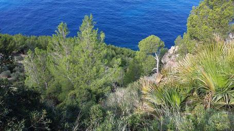 Keywords: view to the sea landscape mallorca nature blue water water sea booked tree rock sun grass karg clouds scrub dry spain