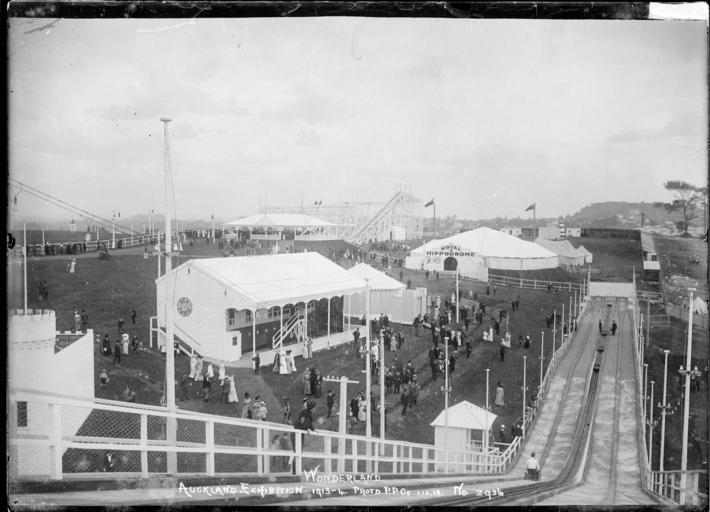 | Keywords: blackandwhite monochrome photo border outdoor black and white View of the Wonderland figure-8 roller coaster and Royal Hippodrome at the Auckland Exhibition. In the foreground is a trolley slide. Mount Eden can be seen in the distance on the righthand side. Photograph taken by William Archer Price, 1 Dec 1913 at the Auckland Exhibition, Auckland Domain. Inscriptions: Inscribed - Photographer's title on negative -bottom centre: Wonderland. Auckland Exhibition 1913-4. Protd. P.P.Co. 1.12.13. No 2936. Quantity: 1 b&w original negative(s). Physical Description: Dry plate glass negative 4.5 x 6.5 inches View of Wonderland showing the Royal Hippodrome and Roller Coaster, Auckland Exhibition, Auckland Domain. Price, William Archer, 1866-1948 :Collection of post card negatives. Ref: 1/2-000888-G. Alexander Turnbull Library, Wellington, New Zealand. natlib.govt.nz/records/22795738 View of the Wonderland figure-8 roller coaster and Royal Hippodrome at the Auckland Exhibition. In the foreground is a trolley slide. Mount Eden can be seen in the distance on the righthand side. Photograph taken by William Archer Price, 1 Dec 1913 at the Auckland Exhibition, Auckland Domain. Inscriptions: Inscribed - Photographer's title on negative -bottom centre: Wonderland. Auckland Exhibition 1913-4. Protd. P.P.Co. 1.12.13. No 2936. Quantity: 1 b&w original negative(s). Physical Description: Dry plate glass negative 4.5 x 6.5 inches View of Wonderland showing the Royal Hippodrome and Roller Coaster, Auckland Exhibition, Auckland Domain. Price, William Archer, 1866-1948 :Collection of post card negatives. Ref: 1/2-000888-G. Alexander Turnbull Library, Wellington, New Zealand. natlib.govt.nz/records/22795738 |