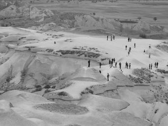 Keywords: viewpoint human valley of love tufa plateau plateau hiking tourists outlook tufa cappadocia turkey black and white