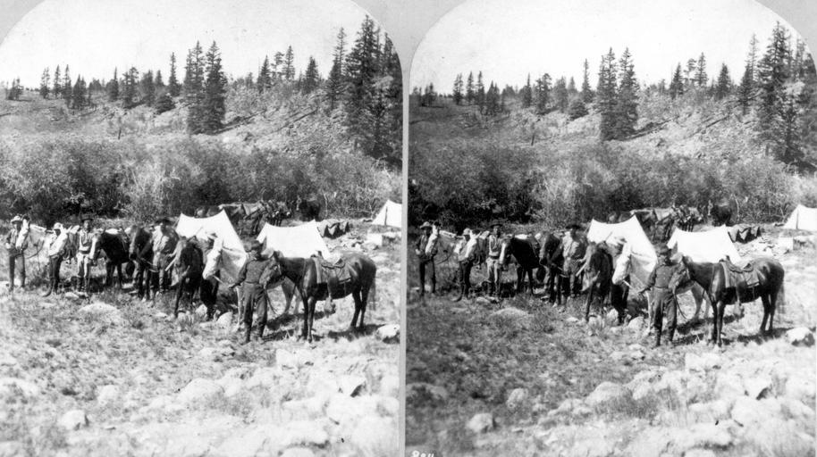 Keywords: stereoscopic stereophotography stereophotographs historical usgs history geology mapping black and white blackandwhite bnw stereograph blackandwhite monochrome outdoor snow black and white Views among the Rocky Mountains of Colorado. Camp scene. The 1874 Photographic Division on the way to Los Pinos and Mesa Verde. Left to right: Smart, Anthony, Mitchell, Whan, Ernest, Ingersoll, and Charley, the cook. Dolly, the mule, stands between Charley and Ingersoll. Colorado. 1874. (Stereoscopic view similar to Jackson, W.H. 359) Views among the Rocky Mountains of Colorado. Camp scene. The 1874 Photographic Division on the way to Los Pinos and Mesa Verde. Left to right: Smart, Anthony, Mitchell, Whan, Ernest, Ingersoll, and Charley, the cook. Dolly, the mule, stands between Charley and Ingersoll. Colorado. 1874. (Stereoscopic view similar to Jackson, W.H. 359)