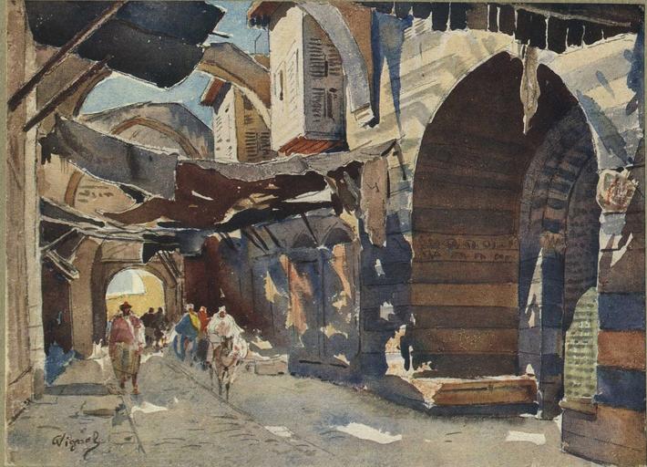Keywords: Vignal Alep.jpg fr Vue du bazar d'Alep Aquarelle de Pierre Vignal 1855-1925 en 1922 1922 own Pierre Vignal other versions Pd-old Aleppo in the 1920s Souqs in Syria Suqs and Khans in Aleppo