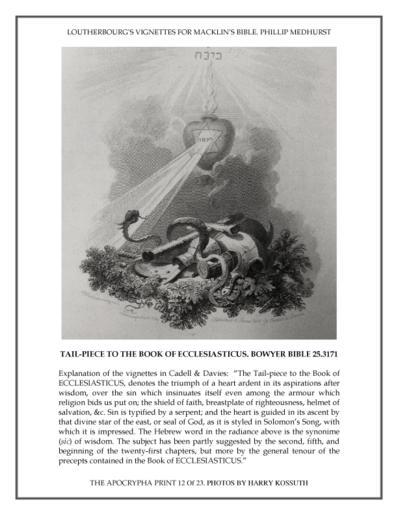 Keywords: Vignette by Loutherbourg for the Macklin Bible 73 of 134. Bowyer Bible Apocrypha. Tailpiece to Ecclesiasticus.gif en Tail-piece to the book of Ecclesiasticus vignette with a serpent curling around a helmet hourglass and crude wooden cross a flaming heart above decorated with a star of David from which light emanates; letterpress in two columns above and on verso 1815 Inscriptions Lettered below image with production detail P J de Loutherbourg delt J Landseer fecit FSA and publication line Published 6 June 1815 by Cadell Davies Print made by John Landseer Dimensions height 490 millimetres sheet ; width 397 millimetres sheet Photos by Harry Kossuth Phillip Medhurst 1815-06-06 PD-Art Ecclesiasticus Vignettes by Loutherbourg for the Macklin Bible Vignette Drawings by Loutherbourg in the Bowyer Bible Art depicting the Deuterocanonical books by Philippe De Loutherbourg John Landseer |