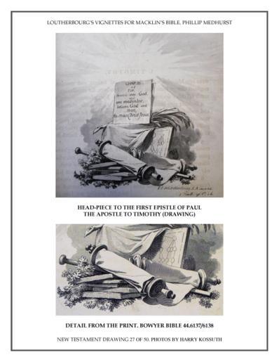 Keywords: Vignette by Loutherbourg for the Macklin Bible 111 of 134. Bowyer Bible New Testament. Headpiece to 1 Timothy.gif en Head-piece to the first epistle of Paul the apostle to Timothy vignette with sheet inscribed ' For there is one God and one mediator ' 1 Timothy 2 5 standing upon a pile of tablets scrolls and a palm branch; letterpress in two columns below and on verso 1800 Inscriptions Lettered below image with production detail Loutherbourg delt W S Sculpsit and publication line Published by T Macklin Fleet Street London Print made by William Skelton Dimensions height 490 millimetres; width 395 millimetres Photos by Harry Kossuth Phillip Medhurst 1800-01-01 PD-old-100 First Epistle to Timothy Vignettes by Loutherbourg for the Macklin Bible Vignette Drawings by Loutherbourg in the Bowyer Bible Art depicting the New Testament by Philippe De Loutherbourg |