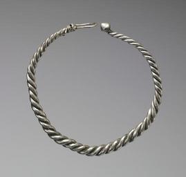 Keywords: Viking - Neck Ring - Walters 571599.jpg This Viking neck ring is made from three twisted silver wires and is fastened by an unusual conical knob and loop clasp It was both jewelry and money to its owner Large neck rings and smaller arms rings were buried in Viking hoards in Ireland Scandinavia and England all important hubs of Viking sea trade This neck ring was found buried with a plain arm ring present location unknown in Fenit County Kerry Ireland in 1880 late 9th-10th century Medieval silver cm 12 11 8 1 9 accession number 57 1599 2826 Found in Fenit County Kerry Ireland 1880 Robert Day Cork date and mode of acquisition unknown Robert Day of Cork Sale Sotheby Wilkinson Hodge London May 19-22 1913 no 452 Permain dealer 1913 by purchase William Randolph Hearst by purchase William Hearst Collection Sale New York February 10 1941 lot 999 no 166 Trustees of the Walters Art Gallery Baltimore February 10 1941 by purchase Walters Art Museum Gift of the members of the Board of Trustees Robert Garrett B Howell Griswold Jr George C Cutler Philip B Perlman and Morgan C Marshall 1941 Early Christian and Byzantine Art Baltimore Museum of Art Baltimore 1947 Jewelry - Ancient to Modern The Walters Art Gallery Baltimore 1979-1980 Objects of Adornment Five Thousand Years of Jewelry from the Walters Art Gallery Baltimore Cooper-Hewitt National Design Museum New York; Chrysler Museum of Art Norfolk; Carnegie Museum of Art Pittsburgh; San Antonio Museum of Art San Antonio; Philbrook Museum of Art Tulsa; Honolulu Academy of Arts Honolulu; New Orleans Museum of Art New Orleans; Milwaukee Art Museum Milwaukee; Minneapolis Institute of Arts Minneapolis; Toledo Museum of Art Toledo; The John and Mable Ringling Museum of Art Sarasota 1984-1987 Jewelry from the Walters Art Museum and the Zucker Family Collection The Walters Art Gallery Baltimore 1987 place of origin Fenit Ireland United Kingdom Walters Art Museum license Medieval metalwork in the Walters Art Museum Jewellery in the Walters Art Museum Viking jewellery Viking Age Ireland Media contributed by the Walters Art Museum needs category review Torcs |