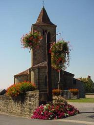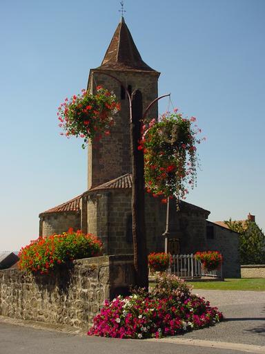 Keywords: Village fleuri.JPG fr La place Saint Julien l'église et des suspensions fleuries own R Julien 2002-09-19 Église de Sainte-Thérence Squares in Allier Hanging baskets in France