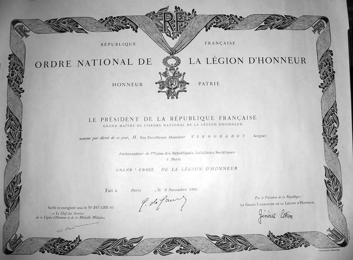 Keywords: VINOGRADOV S A Legion d honneur.jpg ru Г амота кавале а Большого К еста о дена Почётного легиона п инадлежавшая Послу СССР во Ф анции С А Виног адову оё фото Кузнецов А А 02 11 1963 History of the Legion of Honour Grand Cross of the Legion of Honour