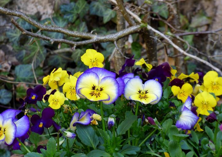 Keywords: violets flowers nature garden blue purple yellow spring