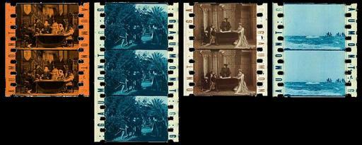 | Keywords: colore colorazione pellicola louis feuillade louisfeuillade 1910 gaumont viraggio architecture door abstract electronics computer circuit Alcuni frammenti di pellicola del film "Cristophe Colomb" (1910) prodotto dalla Gaumont e diretto da Louis Feuillade. Per la colorazione della pellicola venne usata la tecnica del viraggio: la pellicola già sviluppata viene immersa in una soluzione chimica che saturava le zone scure del fotogramma, mentre quelle più chiare rimangono più o meno bianche. La scelta del colore non era casuale, come si nota da questi esempi tinte come l'arancione o il seppia erano sovente utilizzate per scene ambientate in interno. Il blu poteva servire per un ambientazione notturna, un azzurro chiaro è stato qui utilizzato per un paesaggio marino. Alcuni frammenti di pellicola del film "Cristophe Colomb" (1910) prodotto dalla Gaumont e diretto da Louis Feuillade. Per la colorazione della pellicola venne usata la tecnica del viraggio: la pellicola già sviluppata viene immersa in una soluzione chimica che saturava le zone scure del fotogramma, mentre quelle più chiare rimangono più o meno bianche. La scelta del colore non era casuale, come si nota da questi esempi tinte come l'arancione o il seppia erano sovente utilizzate per scene ambientate in interno. Il blu poteva servire per un ambientazione notturna, un azzurro chiaro è stato qui utilizzato per un paesaggio marino. |