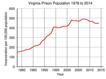 | Keywords: Virginia Prison Population.svg en Virginia prison incarceration rate per 100 000 population from 1978 to 2014 Data from http //www bjs gov/index cfm ty nps BJS 2016-05-11 own Delphi234 other versions current annually Generated with Wikimedia SVG Chart SVG Chart/box cc-zero Prisons in Virginia Imprisonment and detention rates in the United States |