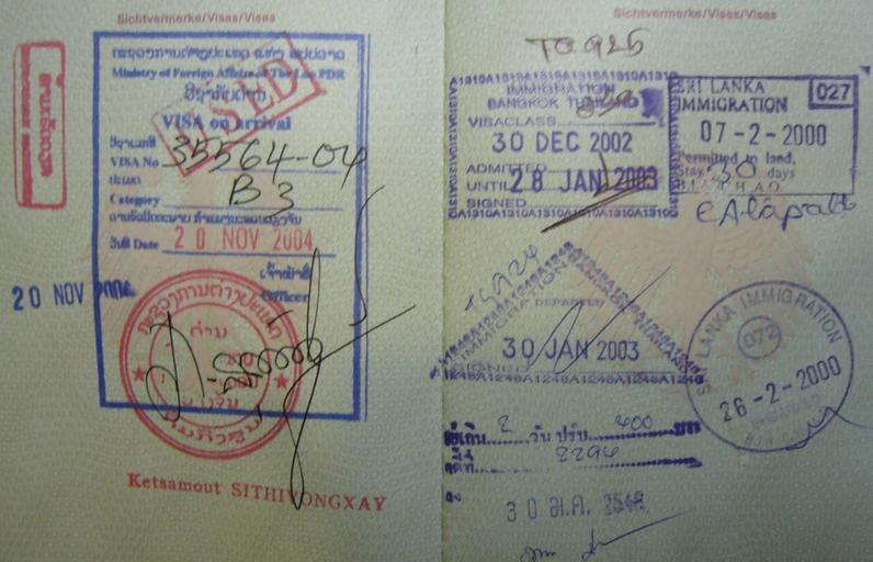 Keywords: Visa.jpg Examples of stamped visa documents issued by Laos Thailand and Sri Lanka from left to right Note the overstay notice in Thai which includes a fine Gestempelte Sichtvermerke v l n r Laos Thailand und Sri Lanka inkl Overstay-Eintrag re unten fa نمونه مهر ویزای لائوس، تایلند و سریلانکا از چپ به راست در پاسپورت Ancien visa du Laos page de gauche Les visas sont maintenant collés sur les pages et munis d'un hologramme own 2005-04-11 User Mattes de Bild Visa jpg en Image Visa jpg Visas of Laos Passport stamps of Thailand Passport stamps of Sri Lanka Taken with Panasonic Lumix DMC-LC50 Work by Mattes 2005 User Mattes/Contributions/Topics/banners coat of arms flags logos seals and signs