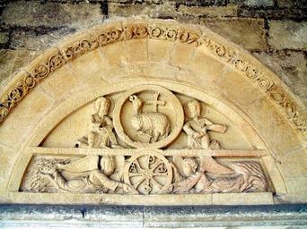 | Keywords: Vitoria - Armentia, Basilica de San Prudencio 08.jpg en Tímpano románico del siglo XII con el Cordero místico y el Crismón empotrado en el pórtico de la Basílica de San Prudencio de Armentia en Vitoria-Gasteiz Álava País Vasco España Own Zarateman 2009-05-24 Chi Rho in Spain Church reliefs in Álava-Araba Basilica of San Prudencio de Armentia Romanesque tympanums in Spain Reliefs of the Agnus Dei | ||||