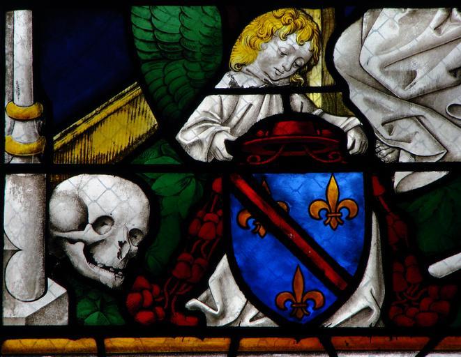 | Keywords: Vitrail Cathédrale de Moulins 160609 32.jpg fr Basilique-cathédrale Notre-Dame de l'Annonciation de Moulins; vitrail du Crucifiement sic fin du 15ème siècle Détail le crâne au pied de la Croix own Vassil 03/07/09 Crucifixion of Christ stained-glass windows in Moulins cathedral Skulls in art Moulins cathedral |