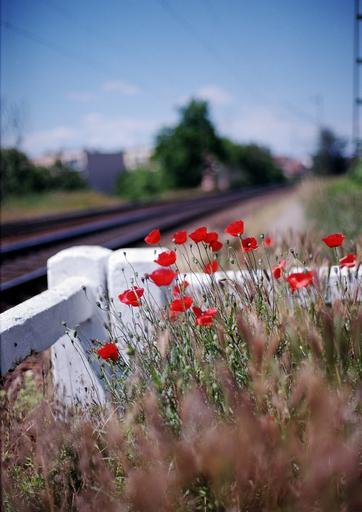 Keywords: vivid poppy station train nature flower spring bloom natural wild floral red sky summer green springtime season blooming wildflower colorful scenic outdoor vibrant sun common