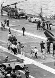 | Keywords: VNAF Hueys on USS Hancock (CVA-19) 1975.jpg Vietnamese Bell UH-1D/H helicopters aboard the U S Navy aircraft carrier USS Hancock CVA-19 in April 1975 Most of her regular air group had been flown to Subic Bay Philippines In the right foreground is the tail of UH-1H-BF s/n 69-15959 U S Navy photo http //www navysite de/cruisebooks/cv19-75/030 htm from the http //www navysite de/cruisebooks/cv19-75/index_004 htm USS Hancock CVA-19 1975 cruise book available at http //navysite de/cruisebooks/index html Navysite de 1975-04 USN PD-USGov-Military-Navy Aboard USS Hancock CV-19 Operation Frequent Wind Bell UH-1 Iroquois in the Vietnam War Air force of South Vietnam VNAF |