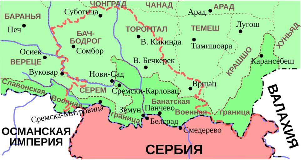 Keywords: Vojvodina XIX ru.svg en Vojvodina in XIX cent Own Jaspe Habsburg Military Frontier Bács-Bodrog County Syrmia County Torontál County Temes County Krassó-Szörény County Maps of the Habsburg period in the history of Serbia Maps of the history of Vojvodina Maps of the history of Banat Maps of the history of Bačka Maps of the history of Syrmia Maps of Austria-Hungary |