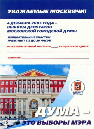 | Keywords: Voter invitation Moscow 2005 1-2.jpg Russian voter invitation card Moscow City Duma elections December 4 2005 Obverse П иглашение РФ на выбо ы депутатов осковской го одской думы 04 12 2005 Лицевая сто она own collection 2005 Moscow City Electoral Commission PD-RU-exempt 4 December Voter invitation cards Elections in Russia 2005 |
