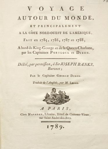 Keywords: Voyage autour du monde - title page 01.jpg en French translation of A voyage round the world but more particularly to the north-west coast of America microform performed in 1785 1786 1787 and 1788 in the King George and Queen Charlotte Captains Portlock and Dixon ; dedicated by permission to Sir Joseph Banks Bart 1789 Cite book Maradan Dixon George Voyage autour du monde et principalement à la côte nord-ouest de l'Amérique fait en 1785 1786 1787 et 1788 par les Capitaines Portlock et Dixon Dédié à Sir Joseph Banks par le Capitaines George Dixon Traduit de l'Anglois par M Lebas Paris 1789 Universiteitsbibliotheek Maastricht Expedition Wikipedia George Dixon 1748-1796 Custom license marker 2014 03 26 PD-old-100 Uploaded with UploadWizard Voyage autour du monde 1789 |