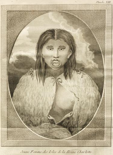 Keywords: Voyage autour du monde - planche XIII - Jeune Femme des Isles de la Reine Charlotte.jpg en French translation of A voyage round the world but more particularly to the north-west coast of America microform performed in 1785 1786 1787 and 1788 in the King George and Queen Charlotte Captains Portlock and Dixon ; dedicated by permission to Sir Joseph Banks Bart 1789 Cite book Maradan Dixon George Voyage autour du monde et principalement à la côte nord-ouest de l'Amérique fait en 1785 1786 1787 et 1788 par les Capitaines Portlock et Dixon Dédié à Sir Joseph Banks par le Capitaines George Dixon Traduit de l'Anglois par M Lebas Paris 1789 Universiteitsbibliotheek Maastricht Expedition Wikipedia George Dixon 1748-1796 Custom license marker 2014 03 26 PD-old-100 Voyage autour du monde 1789 Uploaded with UploadWizard Lip plates Haida |