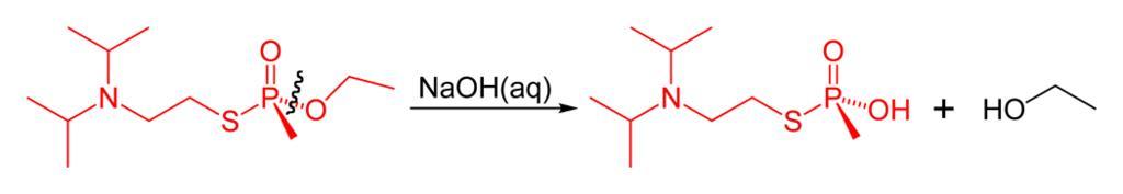 Keywords: VX-solvolysis-P-O-2D-skeletal.png Reaction scheme using skeletal formulae for the solvolysis of VX at its P-O bond with aqueous sodium hydroxide own 2007-09-08 Ben Mills Benjah-bmm27 Images by Ben Mills VX nerve agent