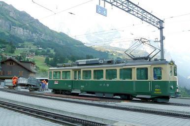 | Keywords: WAB Guetertriebwagen 104 Wengen.jpg  en Wengernalp rack railway Motor coach BDhe 4/4 104 of 1951 used as cargo mover with new traction arrangement 2005 from Vossloh-Kiepe GmbH Duesseldorf With double dump wagon Fk-u 807 in Wengen station “ 2009-08-05 de Wengernalpbahn Zahnradbahn Als Guetertriebwagen umgebauter BDhe 4/4 104 von 1951 seit 2005 mit neuer AntriebsausrĂĽstung Vossloh-Kiepe Mit Doppelkippwagen Fk-u 807 im Bahnhof Wengen “ 05 08 2009 own Rahimsa Images 2009-08-05 WAB BDhe 4/4 Bt Vossloh Kiepe Wengen railway station |