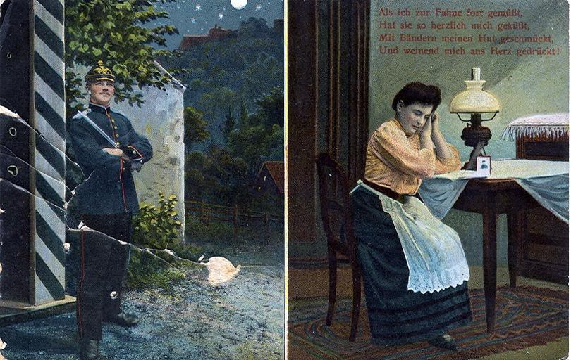 | Keywords: Wachsoldat.jpg en Postcard dated 9 4 1915 Title Poem of a soldier on guard to his wife back home de Postkarte datiert 9 4 1915 Titel Gedicht eines Wachsoldaten an seine Frau zuhause private collection of Wolfgang Sauber Xenophon anonymous 06 11 2008 PD-1923 anonymous-EU World War I postcards of German Empire Old military postcards of Germany Postcards of couples |