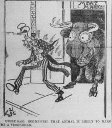Keywords: Walker cartoon about beef prices and vegetarianism.jpg Uncle Sam is chased out of a market by a bull whose horns are marked Trust business BEEF TRUST and ADVANCED PRICES he comments that the animal will likely make him become a vegetarian 1904-04-06 http //chroniclingamerica loc gov/lccn/sn88085187/1904-04-06/ed-1/seq-4/ the Tacoma Times Ryan Walker 1870 - June 23 1932 other versions PD-old-70-1923 Uploaded with UploadWizard 1900s political cartoons of the United States Images from The Tacoma Times Cartoons by Ryan Walker 1904 cartoons Uncle Sam |