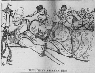 Keywords: Walker cartoon about the risks of European nations fighting over Asian territory.jpg Imperial Russia the British Empire personified as John Bull the French Colonial Empire and the German Empire climb all over the sleeping giant that is the Yellow Peril an alarmed Uncle Sam reads out a NOTE TO THE POWERS <br>Caption WILL THEY AWAKEN HIM him the Yellow Peril 1904-03-05 http //chroniclingamerica loc gov/lccn/sn88085187/1904-03-05/ed-1/seq-1/ The Tacoma Times Ryan Walker December 26 1870 - June 23 1932 other versions PD-old-70-1923 ImageNote 1 769 330 100 78 1892 1468 2 RUSSIA ImageNoteEnd 1 ImageNote 2 1363 323 78 78 1892 1468 2 John Bull ImageNoteEnd 2 ImageNote 3 1645 391 117 59 1892 1468 2 FRANCE ImageNoteEnd 3 ImageNote 4 1738 132 137 306 1892 1468 2 Although this man is not labeled as Germany or German Empire he is wearing the characteristic German pickelhaube ImageNoteEnd 4 ImageNote 5 318 519 117 132 1892 1468 2 NOTE TO THE POWERS ImageNoteEnd 5 ImageNote 6 563 504 213 152 1892 1468 2 THE YELLOW PERIL ImageNoteEnd 6 Uploaded with UploadWizard 1900s political cartoons of the United States Images from The Tacoma Times Cartoons by Ryan Walker 1904 cartoons Uncle Sam Imperialism John Bull |