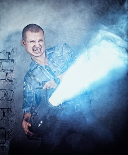Keywords: wall man grin teeth person portrait attack brick war laser smoke hyperboloid jeans shirt