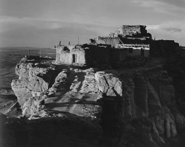 Keywords: walpi arizona black and white buildings old historical landmark 1941 sky clouds mountains valley ravine nature outside