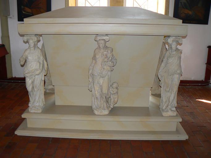 Keywords: Walpurgis-Sarkophag 01.JPG en Walpurgis-Sarkophag wood 1997 with Sandstein-Karyatiden 1586 in St Magnus Kirche in Esens/Germany own Gerardus 2009-04-16 St Magnus Esens