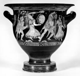 | Keywords: Walters-Dresden Painter - Bell-Krater with Satyrs and Maenads and Three Draped Men - Walters 4875 - Side A.jpg This red-figure bell-krater depicts satyrs and maenads revelling on the front On the left a satyr wearing a fawn skin for a cloak and a wreath stands to the right; in his right hand he holds up a thyrsos from which an ivy vine hangs In front of him a maenad dances right looking around She wears a peplos girded at the waist bracelets earring wreath and possibly a necklace Over her head she holds a thyrsos in her right hand and in her left is a tympanum Next comes a satyr who goes right looking around He also wears a fawn skin for a cloak and a wreath His right arm is extended back over his head and in his left hand he holds a thyrsos On the right another maenad dances right looking around She wears a peplos diadem earring necklace bracelets and wreath and holds a ribbon between her hands Rocks and foliage fill out the scene On the back are three mantled youths two to the right and the third to the left The first holds a circular object possibly a aryballos in his extended right hand The one in the center gestures withhis right hand The third holds an aryballos by a string in his extended right hand A strigil hangs by his head The last two wear fillets Revelling satyrs and maenads is a popular subject at this time and similarly posed dancing figures are common ca 390 380 BC late Classical terracotta with handles cm 33 6 34 7 h x diam ; at mouth cm 34 2 diam ; at foot cm 17 1 diam accession number 48 75 30808 Don Marcello Massarenti Collection Rome cat no 195 Henry Walters city Baltimore Walters Art Museum Henry Walters Acquired by Henry Walters with the Massarenti Collection 1902 place of origin Attica Greece Walters Art Museum license Ancient Greek red-figure pottery in the Walters Art Museum Media contributed by the Walters Art Museum needs category review Walters-Dresden Painter Media contributed by the Walters Art Museum needs artist update Satyrs in ancient Greek pottery Dancing maenads in ancient Greek pottery |