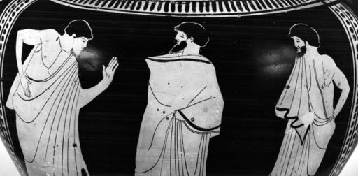Keywords: Walters Painter - Red-Figure Column Krater - Walters 4870 - Side B Detail.jpg This krater a vase for mixing water with wine by the Walters Painter depicts a woman holding a spindle A bearded man faces her and a youth stands behind her with his right hand extended The artist's drawing is known for stiff drapery folds stylized hands and prominent chins The frieze showing a bull between two lions on the neck of the vase is rare on red-figure column kraters ca 480 BC Classical terracotta cm 31 1 25 3 accession number 48 70 13932 Don Marcello Massarenti Collection Rome cat no 233 Henry Walters city Baltimore Walters Art Museum Henry Walters Acquired by Henry Walters with the Massarenti Collection 1902 Déjà Vu Recurrence The Walters Art Museum Baltimore 2007-2008 place of origin Athens Greece Walters Art Museum license Ancient Greek red-figure pottery in the Walters Art Museum Walters Painter Media contributed by the Walters Art Museum needs category review |