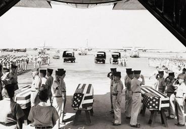 Keywords: Caskets containing the bodies of seven American helicopter crewmen killed in a crash on January 11, 1963 were loaded aboard a plane on Monday, Jan. 14 for shipment home. The crewmen were on board a H21 helicopter that crashed near a hut on an Island in the middle of one of the branches of the Mekong River, about 55 miles Southwest of Saigon. (AP Photo) vnm flag military respect standing stars strips transportation |