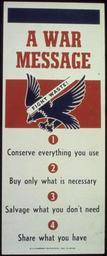 | Keywords: "A war message - Fight waste" - NARA - 513742.tif  Scope and content General notes 513742 Local identifier 44-PA-295 Office for Emergency Management Office of War Information Domestic Operations Branch Bureau of Special Services 03/09/1943 - 09/15/1945 Still Picture Records Section Special Media Archives Services Division NWCS-S National Archives at College Park 8601 Adelphi Road College Park MD 20740-6001 1941 - 1945 Record group Record Group 44 Records of the Office of Government Reports 1932 - 1947 Record group ARC 373 World War II Posters compiled 1942 - 1945 Series ARC 513498 File unit File unit ARC Variant control numbers NAIL Control Number NWDNS-44-PA-295 yes Other versions <gallery> File A_war_message_-_Fight_waste _-_NARA_-_513742 tif tif File A_war_message_-_Fight_waste _-_NARA_-_513742 jpg jpg </gallery> NARA-cooperation PD-USGov Wartime economy propaganda World War II posters from the United States NARA TIF images with categorized JPGs Waste Sharing Eagles in art |
