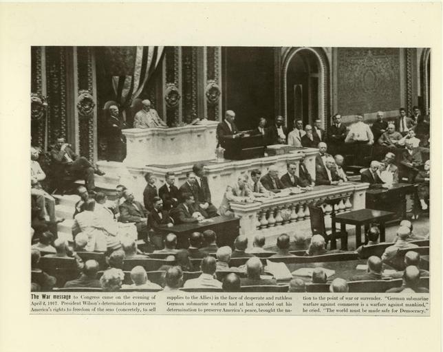 Keywords: president wilson world war one worldwarone clark marshall germany congress monochrome Local Accession Number: 2073 Description: The war message to Congress came on the evening of April 2, 1917. President Wilson's determination to preserve America's rights to freedom of the seas (concretely, to sell supplies to the Allies) in the face of desperate and ruthless German submarine warfare had at last canceled out his determination to preserve America's neutrality. "German submarine warfare against commerce is a warfare against mankind," he cried. "The world must be made safe for democracy." Photographer: J.V. Buck Source: Unknown Size: 25x14 (mounted), 28x19 Medium: Print, Black and White Date: 04-02-1917 Local Accession Number: 2073 Description: The war message to Congress came on the evening of April 2, 1917. President Wilson's determination to preserve America's rights to freedom of the seas (concretely, to sell supplies to the Allies) in the face of desperate and ruthless German submarine warfare had at last canceled out his determination to preserve America's neutrality. "German submarine warfare against commerce is a warfare against mankind," he cried. "The world must be made safe for democracy." Photographer: J.V. Buck Source: Unknown Size: 25x14 (mounted), 28x19 Medium: Print, Black and White Date: 04-02-1917 |