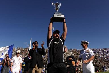 Keywords: Warrior Games athletes honored at Navy-Air Force football game 141004-D-DB155-024.jpg en Army team captain Frank Barroqueiro raises the Commander ™s Cup presented to him by the Chairman of the Joint Chiefs of Staff Gen Martin E Dempsey second from right during a halftime of the Navy-Air Force football game presentation honoring the 2014 Warrior Games athletes in Colorado Springs Colo Oct 4 2014 DoD News photo by EJ Hersom 2014-10-04 EJ Hersom https //www dvidshub net/image/1598064 141004-D-DB155-024 2014-10-04 22 27 COLORADO SPRINGS CO US PD-USGov Martin E Dempsey Images from DoD uploaded by Fæ |