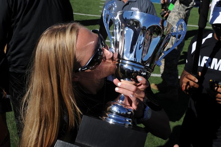 | Keywords: Warrior Games athletes honored at Navy-Air Force football game 141004-D-DB155-032.jpg en Army team's Anne Oravec kisses the 2014 Warrior Games Commander ™s Cup on the Air Force Academy football field during a halftime presentation for the Warrior Game athletes Navy in Colorado Springs Colo Oct 4 2014 Army won the cup and Air Force won their football game against Navy DoD News photo by EJ Hersom 2014-10-04 EJ Hersom https //www dvidshub net/image/1598080 141004-D-DB155-032 2014-10-04 22 28 COLORADO SPRINGS CO US PD-USGov 2014 Warrior Games Images from DoD uploaded by Fæ |