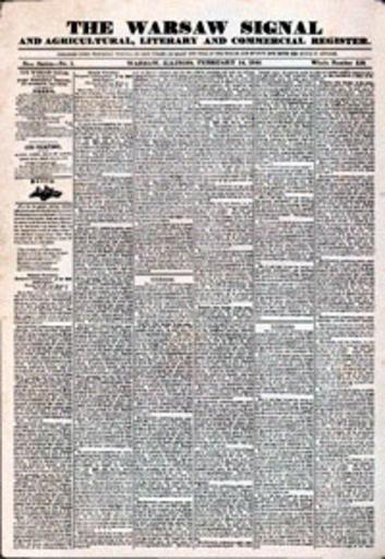 Keywords: WarsawSignal.jpg The w Warsaw Signal a newspaper edited and published in Warsaw Illinois during the 1840s and early 1850s For most of its history the Signal's editorial stance was one of vigorous anti-Mormonism and the advancement of the policies of the Whig Party United States Whig Party Available at http //www sidneyrigdon com/dbroadhu/IL/sign1842 htm sidneyrigdon com Sesmith wikipedia en <br>Owned edited and published by Thomas C Sharp who died in 1894 PD-US PD-old-100 Original upload log en wikipedia ARTEST4ECHO CommonsHelper page en wikipedia WarsawSignal jpg 2007-08-10 09 01 Sesmith 200×290× 36717 bytes <nowiki> PD-old Available at http //www sidneyrigdon com/dbroadhu/IL/sign1842 htm Newpaper published in 1842 Owned edited and published by Thomas C Sharp who died in 1894 </nowiki> Criticism of Mormonism Companies based in Illinois Newspapers of Illinois Warsaw Illinois Religion in Illinois 1840 establishments |