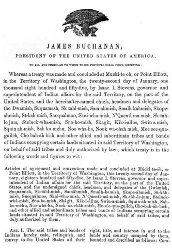 | Keywords: Washington edu Treaty betw. US & Duw. Suq. & other allied, 22Jan1855, Dwamish-3.JPG image of document page 3 of 10 ; Treaty between the United States and the Duwamish Suquamish and other allied and subordinate tribes of Indians in Washington Territory January 22 1855 ratified April 11 1859 p 3 http //content lib washington edu/cgi-bin/viewer exe CISOROOT /imlsmohai CISOPTR 2699 CISOMODE thumb University of Washington Library Digital Collections 1859 U S Government U S Government document; also pre-1923 publication There are images for document pages 1 3 6 10 of 10 PD-USGov Original upload log en wikipedia Magnus Manske CommonsHelper page en wikipedia Washington_edu_Treaty_betw _US_ 26_Duw _Suq _ 26_other_allied 2C_22Jan1855 2C_Dwamish-3 JPG 2006-08-05 03 05 GoDot 500×722× 110873 bytes <nowiki>author U S date 1859; source University of Washington Libraries UW Digital; descr p 3 Treaty of Point Elliott 1855 PD-US </nowiki> Law of the United States 1855 in the United States Treaties with the United States as a party 1855 texts Mukilteo Washington Washington state in the 1850s Indigenous peoples of North America |