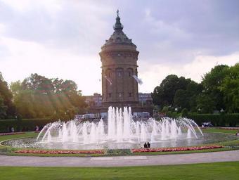 Keywords: Wasserturm in Mannheim Becken 02.jpg water tower of Mannheim Germany 2006-07-04 own Immanuel Giel 49 28 59 5 N 8 28 40 0 E heading 300 Mannheimer Wasserturm